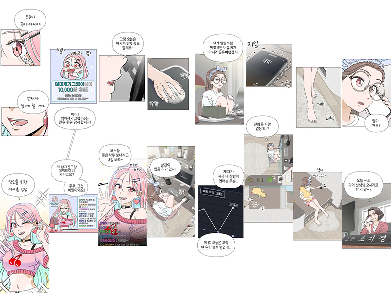 • 스크롤 연재 방식에 맞춰 컷 사이의 여백과 호흡을 재구성하고 전체적인 완성도를 점검합니다.