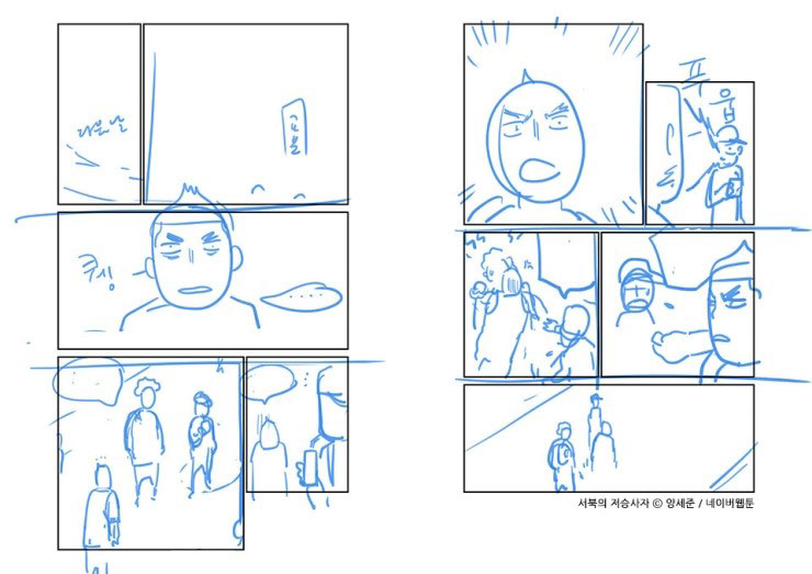 A <서북의 저승사자>의 경우 대사 정리와 콘티 작업에 3~4일, 작화에 하루~이틀 정도를 썼습니다. 자연스럽게 읽히는 것을 가장 중요하게 생각하기 때문에 대사와 콘티에 가장 많은 시간을 할애하고 있습니다.